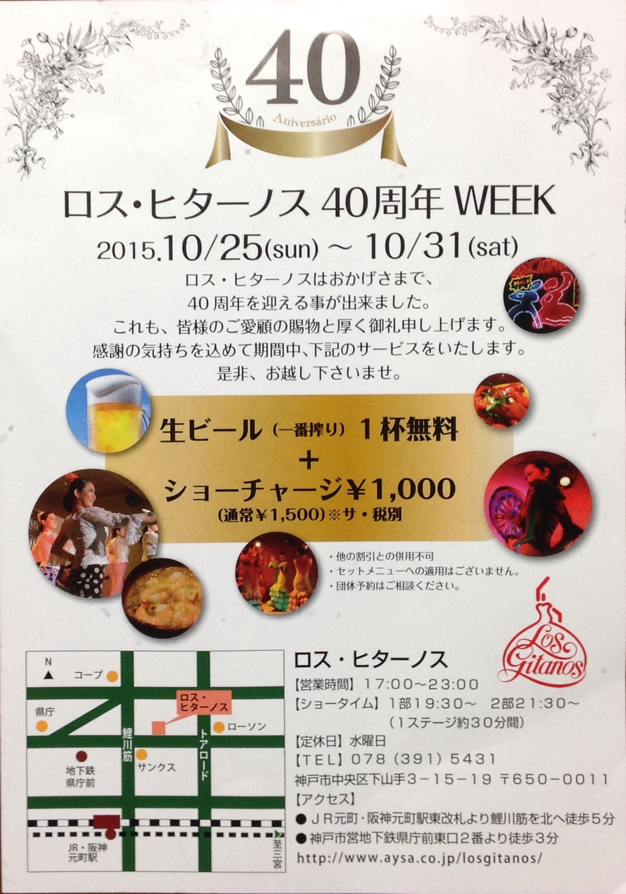 スペイン在勤時代からの長~いお付き合いの神戸にある老舗タブラオ フラメンコ tablao flamenco の ロスヒタノス Los Gitanos さんがこの度めでたく40周年を迎えられました。