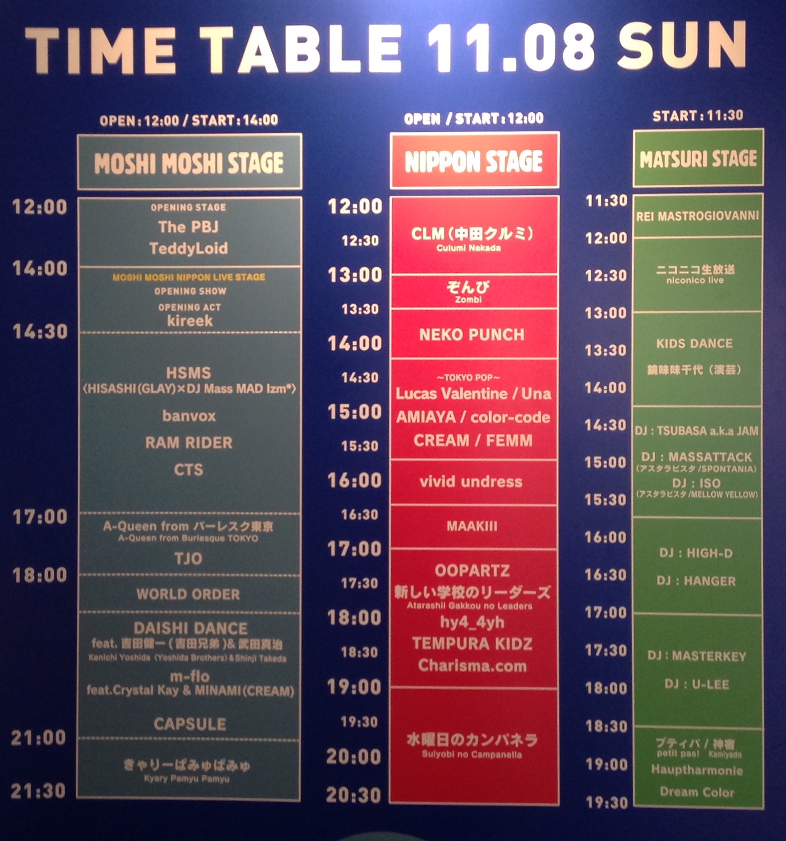 日本のポップカルチャーを世界に発信しようとする祭典Moshi Moshi Nippon Festival 2015 in Tokyo の最終日に行ってきました。ご招待いただきどうもありがとうございました!みなさんも早速クリックして楽しんでください!3日間で2万5千人以上が来場、うち外国人が9千人だったそうです。最後のとりがご存知きゃりーぱみゅぱみゅさん!