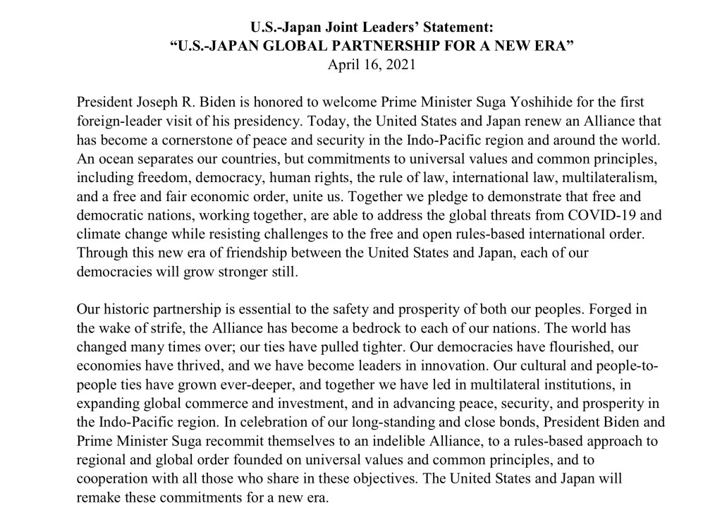 菅総理が訪米してバイデン大統領と会談、首脳会談後、発表された共同声明において、中国が軍事的圧力を強める現状を踏まえ、尖閣諸島問題、台湾問題、新疆ウイグル自治区の人権問題等に言及、日米両国が中国と対峙する姿勢を鮮明に打ちだしました。日本語と英語のテキストはホワイトハウスと日本外務省の web サイトで読むことができます。